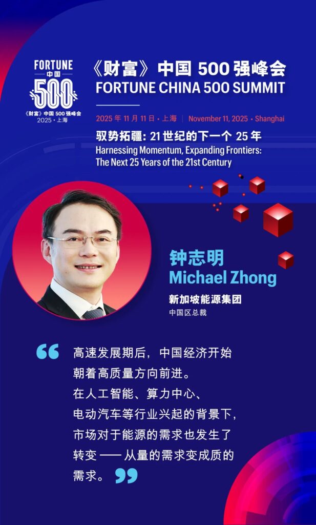 随着中国经济从高速发展迈向高质量发展,能源行业也在经历深刻变革与转型。近日,新加坡能源集团中国区总裁钟志明受邀参加《财富》中国500强峰会,在主题为“紧迫的气候行动和它串联的万亿产业链”圆桌论坛上,与业内嘉宾共同分享探讨对能源行业的观察与思考。